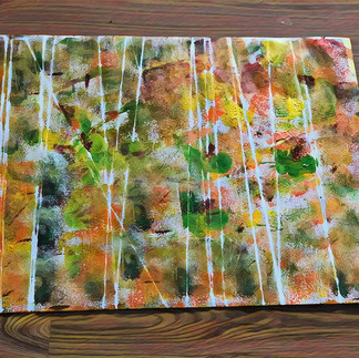 Kartkę owijamy sznurkiem dość ściśle oplatając ją w dowolny sposób, gąbkę pokrywamy farbami w różnych kolorach i przyciskamy ją do kartki zapełniając całą białą przestrzeń. Na końcu zdejmujemy sznurek z kartki. Białe pasy powstałe po zdjęciu sznurka przypominają trochę pnie brzozy. Krajobraz jesiennego lasu gotowy!